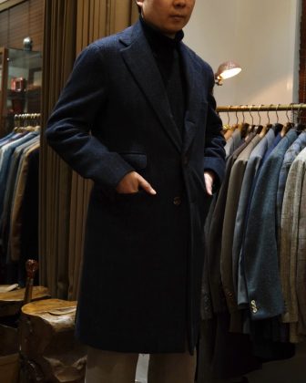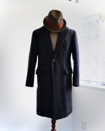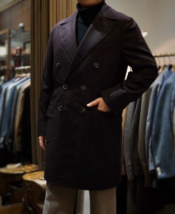 アントニオ・パニコ、ビスポークコート。Size50-52相当。 氏が全盛期にあった頃の作品で、堂々たるチェスターコートでありながら、過度な威圧感を与えない佇まいが印象的だ。 フランネル系のウール生地は滑らかで、しっとりとした質感を持ち、着込むほどに表情を深めていく。 パニコの仕立てに見られる「柔」と「剛」の同居、その中でも本作は剛を軸にしながら、随所に柔らかさを感じさせる一着である。本作は今回の二日間のイベント限定展示販売品となり、当店においても今後の再入荷が見込めないアーカイブピース。