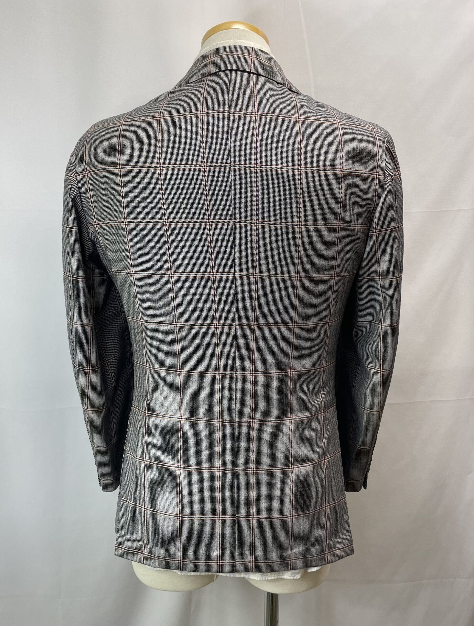 ハイゴージピークドラペル、フロント3つボタン、袖口4つボタン本開き本切羽(第4ボタン眠り)、両脇はラウンドパッチポケット、左胸に美しいカーブのバルカポケット、内側に両玉縁ポケット3