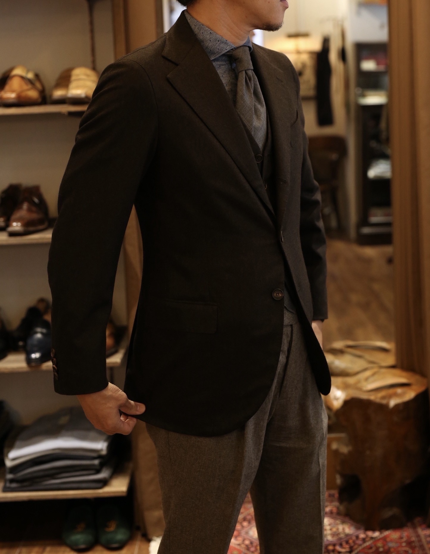 ・・枚挙にいとまが無いほどの素晴らしい手仕事の仕立て技術により、伝統的ナポリテーラードをベースに旬なエッセンスも取り入れた曲線を描き、ハイセンスで都会的な雰囲気を醸し出します。