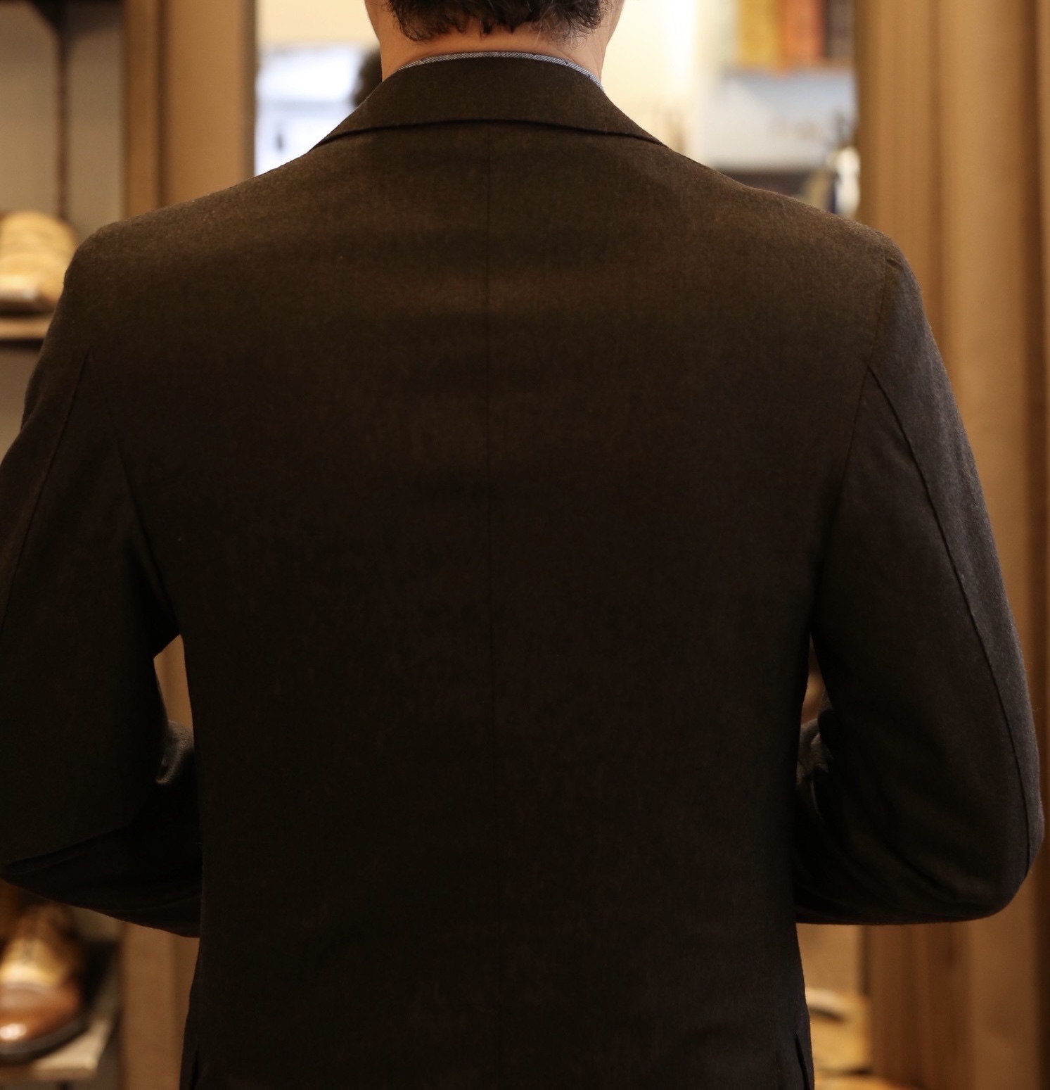 そしてナポリテーラード真骨頂の柔らかい袖付けですから、肩~袖アーム部分はこの上無く軽やかで、ジャストフィットして自由度も高く、軽快で柔らかな着心地。