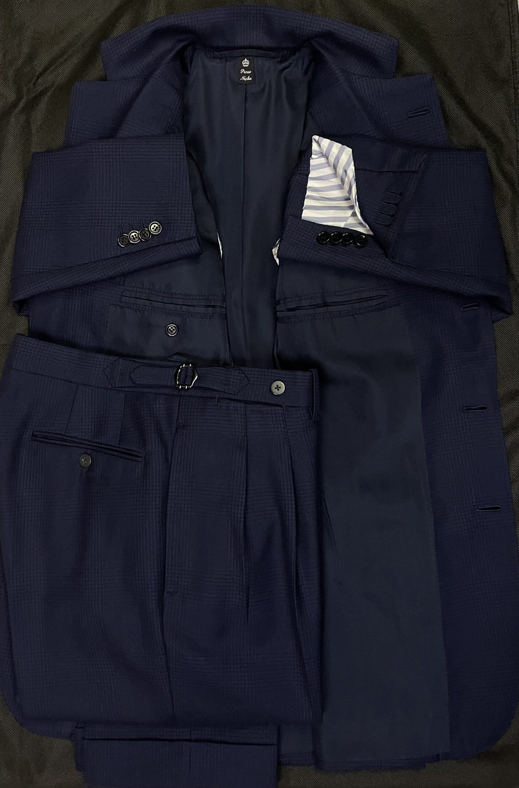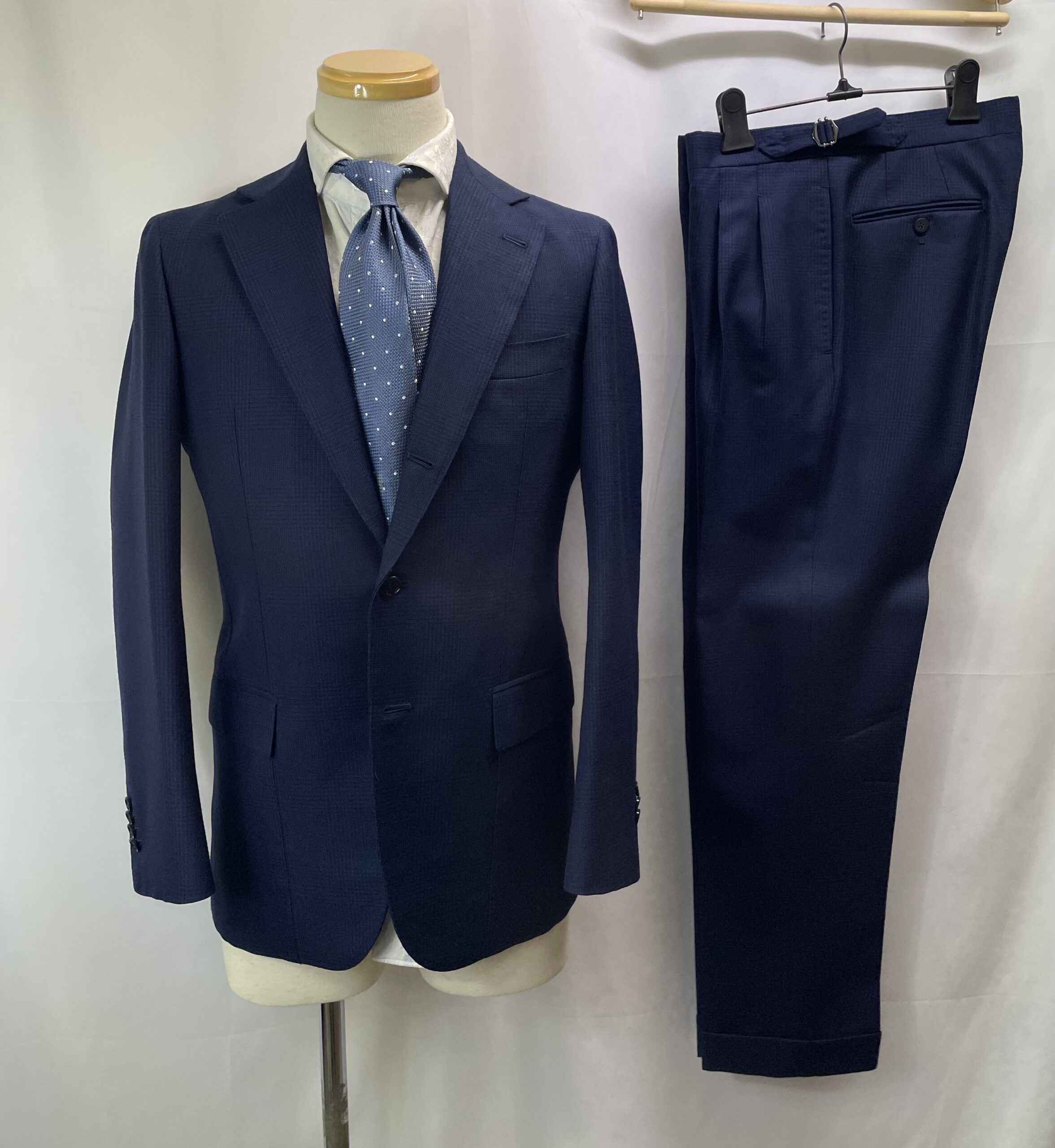 その正統クラシコイタリアーノ・サルトリアの頂点に君臨するナポリ仕立て最高峰の珠玉の貴重なハンドメイド仕立てのネイビースーツ。