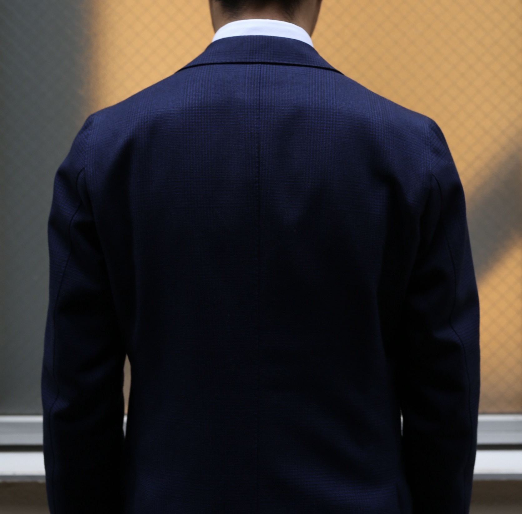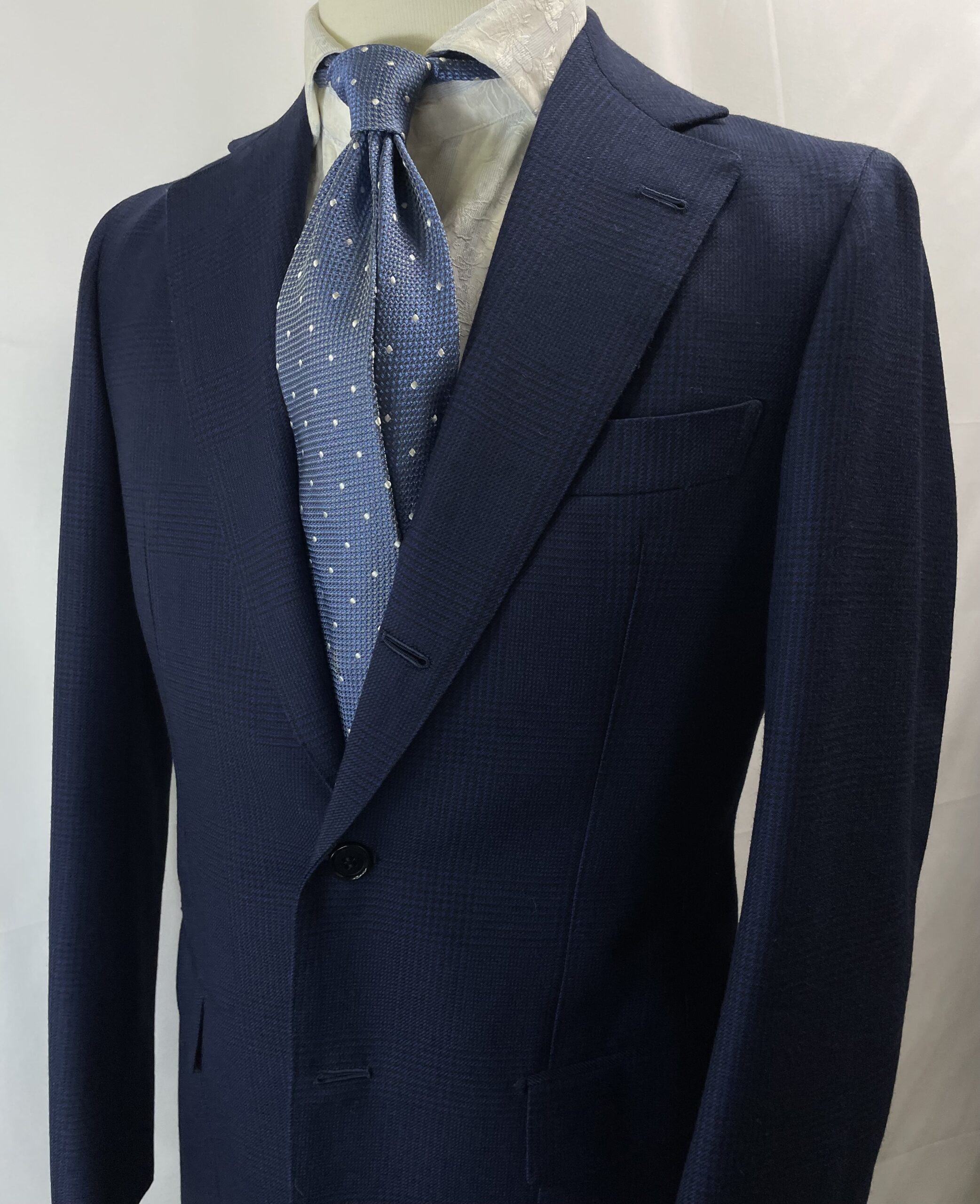 巧みなパターンと精巧なハ刺し、丹念なアイロンワークによる美しいラペルの返り。