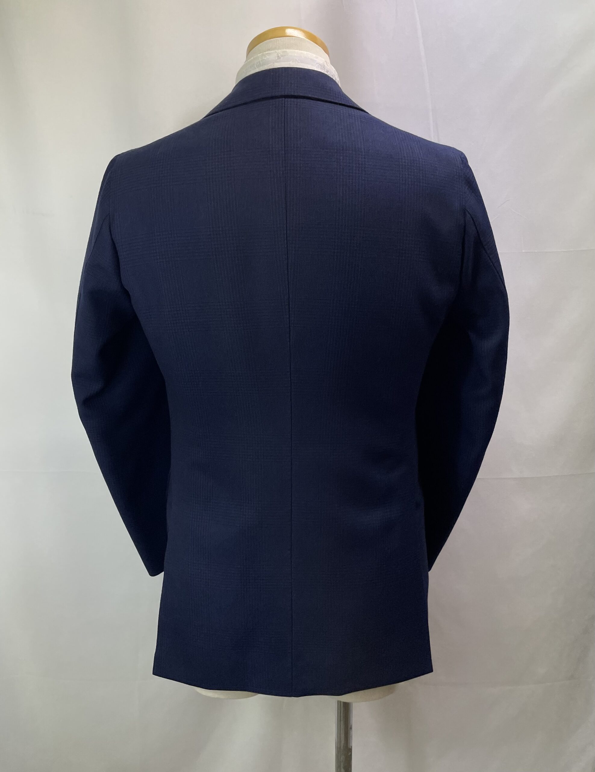 ハイゴージノッチドラペル、フロント3つボタン段返り、袖口は4つ重ねボタン本開き本切羽、両脇はD管留め&両玉縁フラップポケット、左胸に美しいカーブのバルカポケット、内側に両玉縁ポケット2つ、お台場仕立て、総裏地、サイドベンツ。