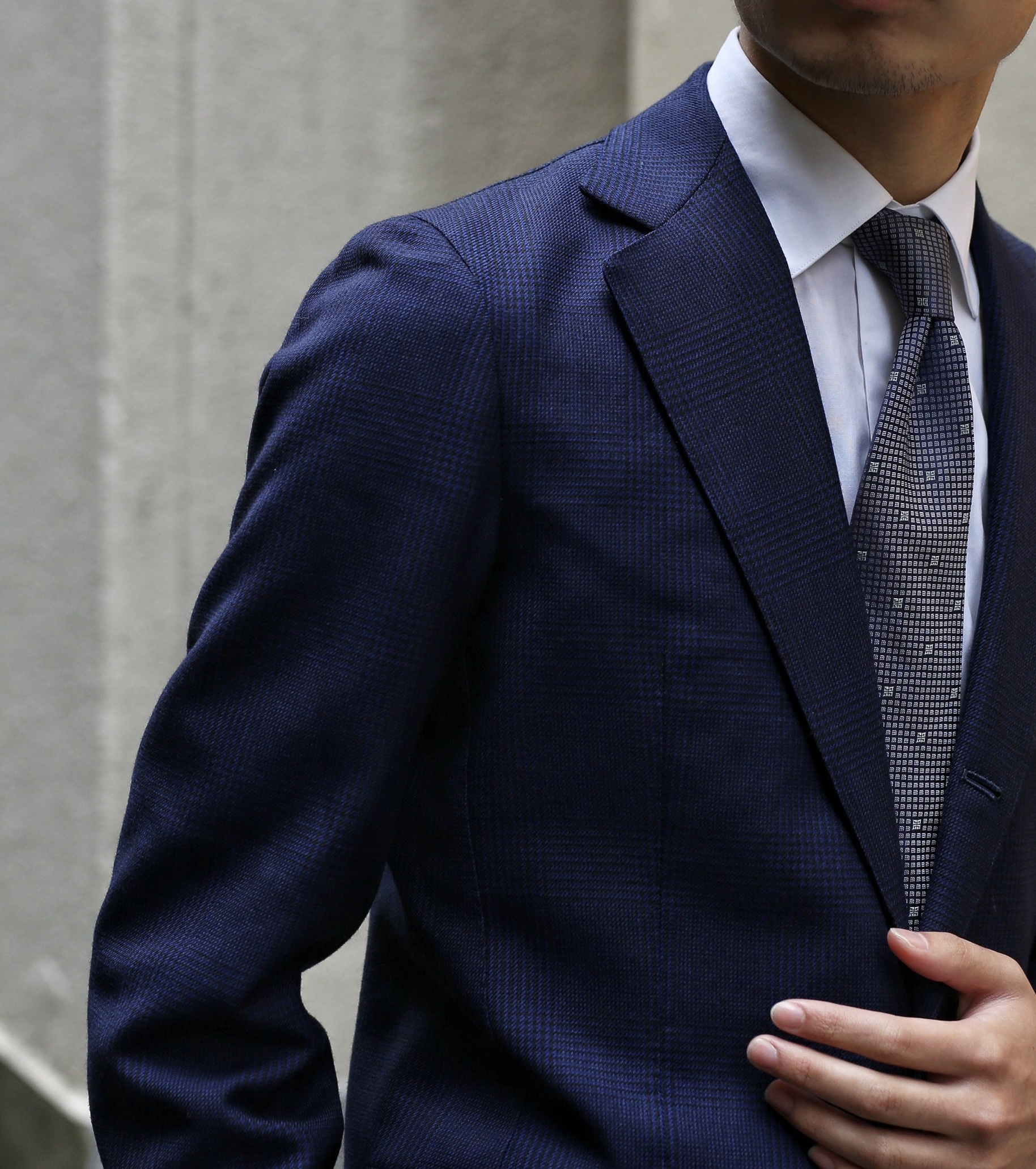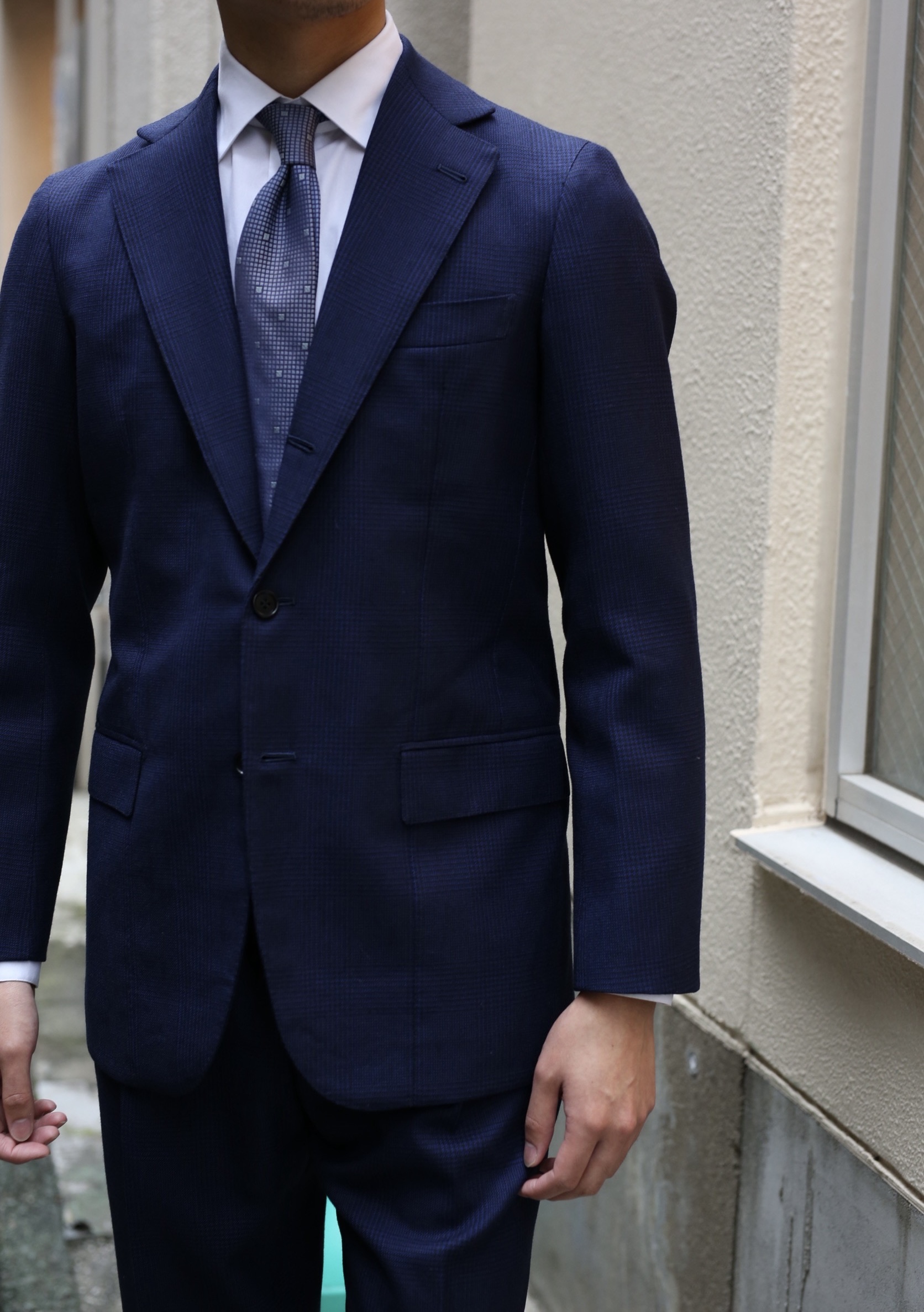 エレガントで貫禄あるハイゴージノッチドラペル・フロント段返り3つボタン・バランス良いドロップ寸と、今の時代を反映した旬で美しい正統派クラシコイタリアーノシルエット。