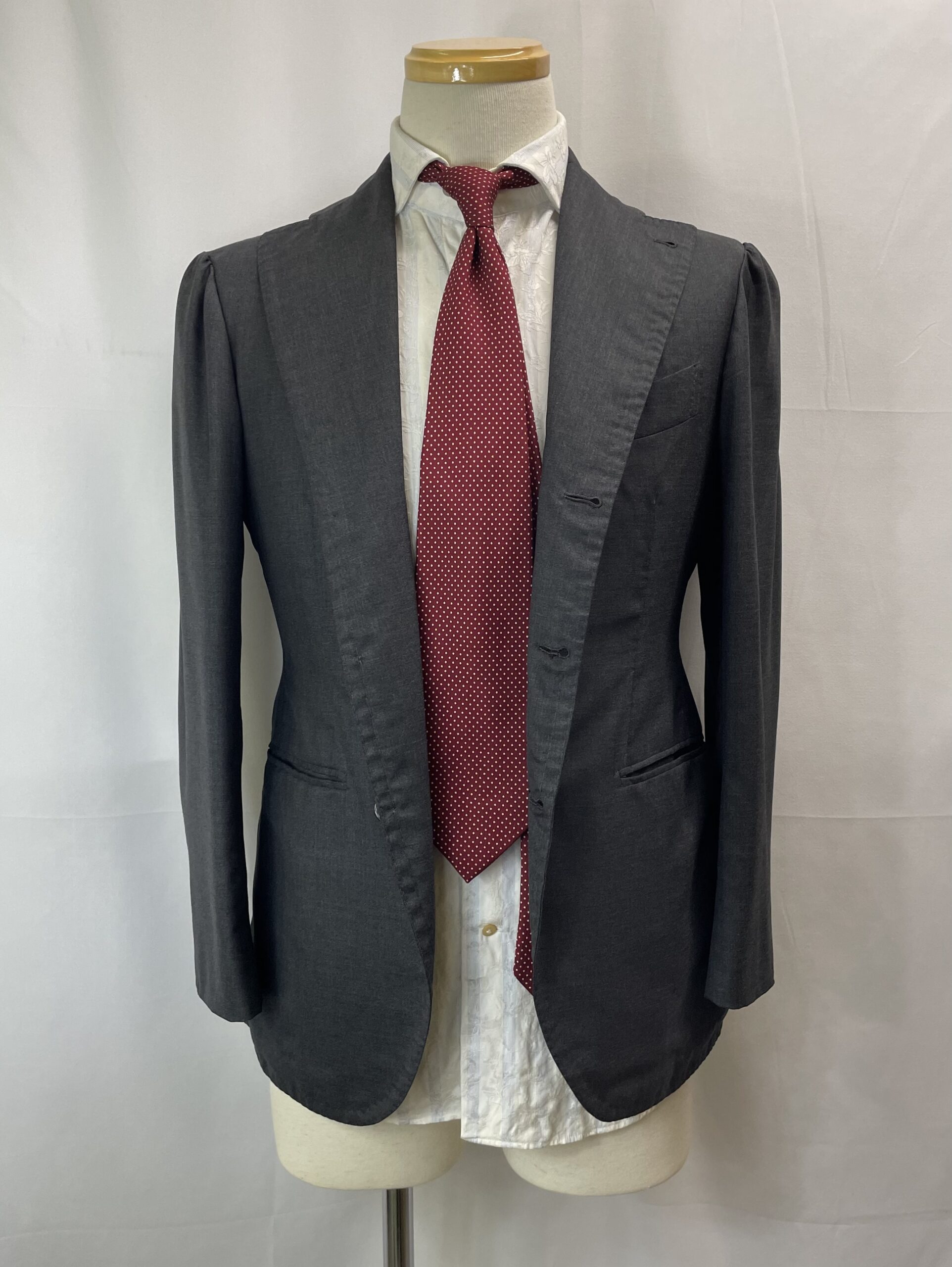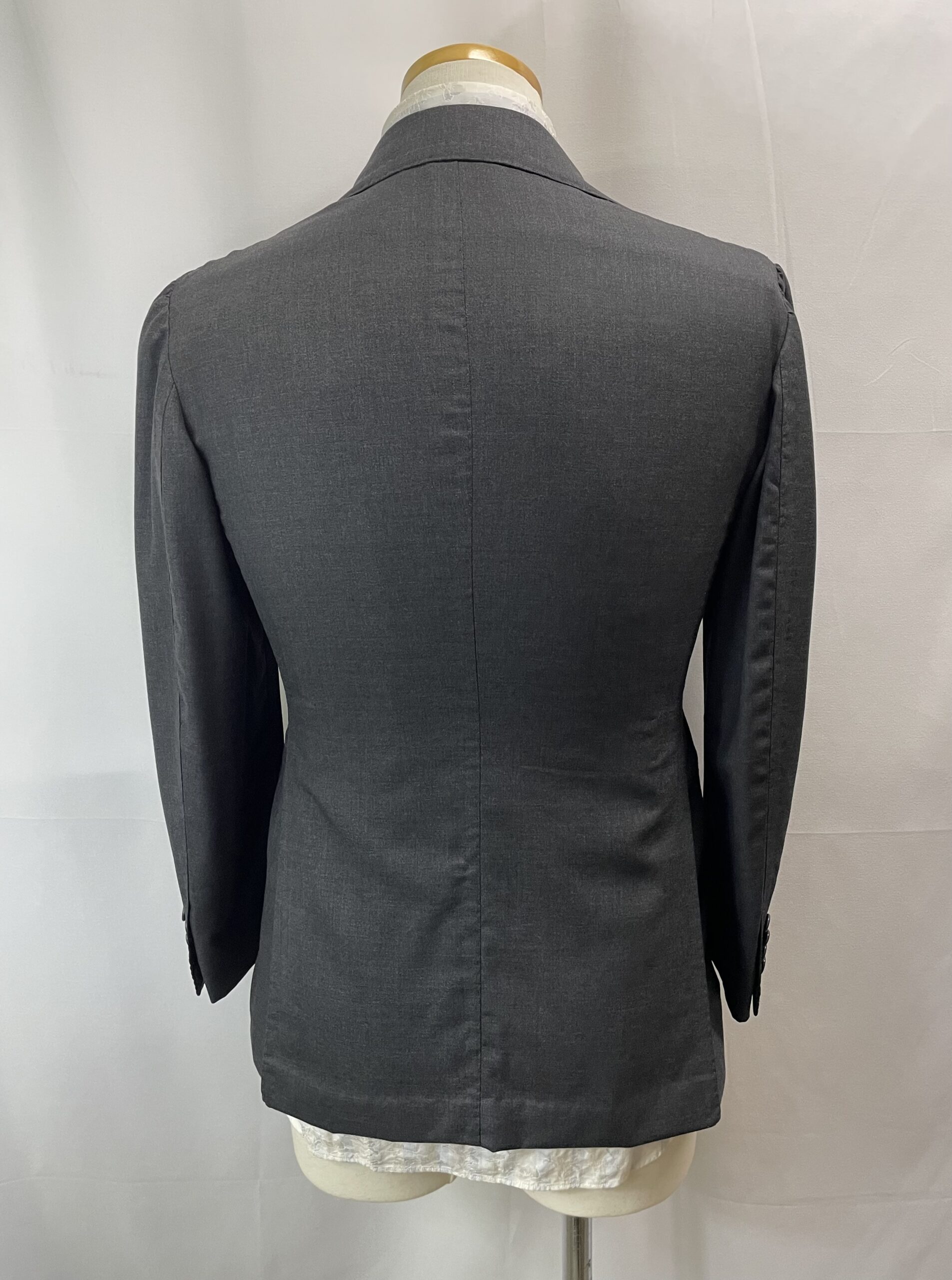 ハイゴージノッチドラペル、フロント段返り3つボタン、袖口は4つ重ねボタン本開き本切羽、両脇はD管留め&両玉縁ポケット、左胸に美麗なカーブのバルカポケット、内側に両玉縁ポケット2つ、贅沢な大見返し仕立て、背抜き裏地、サイドベンツ。