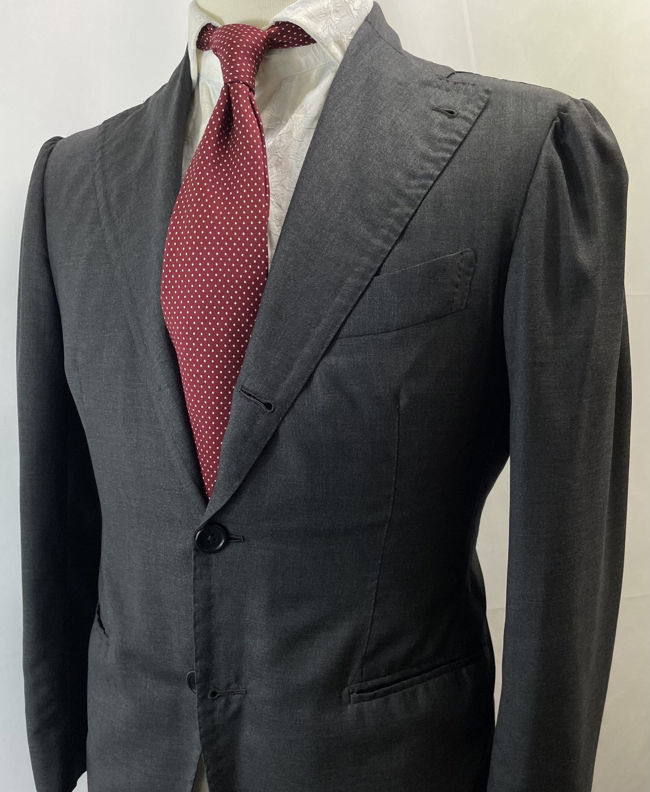 ディテールを例に取れば、ノーパッドで盛られた肩先のコンケープドショルダーに貫禄あるエレガントな太ラペル。