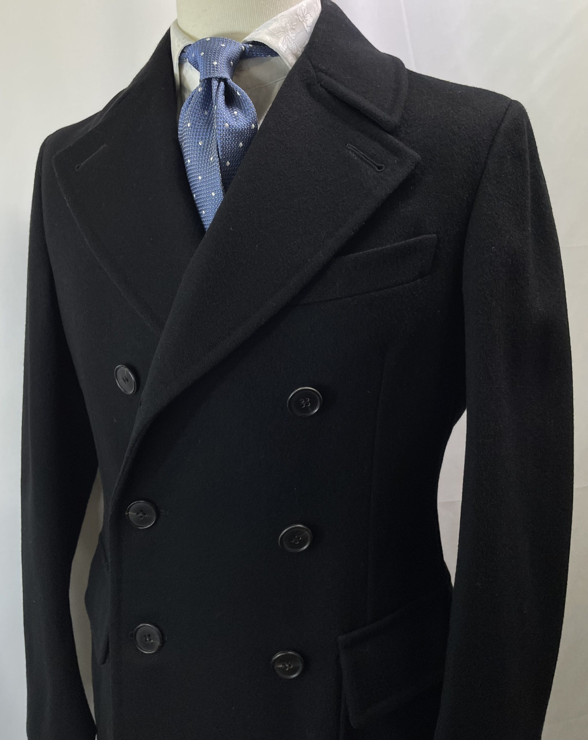 アルスター型ラペル、フロント3つ×2列ボタン、袖口4つ重ねボタン本開き本切羽(第3,4ボタン眠り)、両脇にフラップ付きパッチポケット、左胸に美麗なバルカ型ポケット、背側2ボタン留めウエストベルト付き、贅沢な大見返し仕立て、背抜き裏地、センターベント。