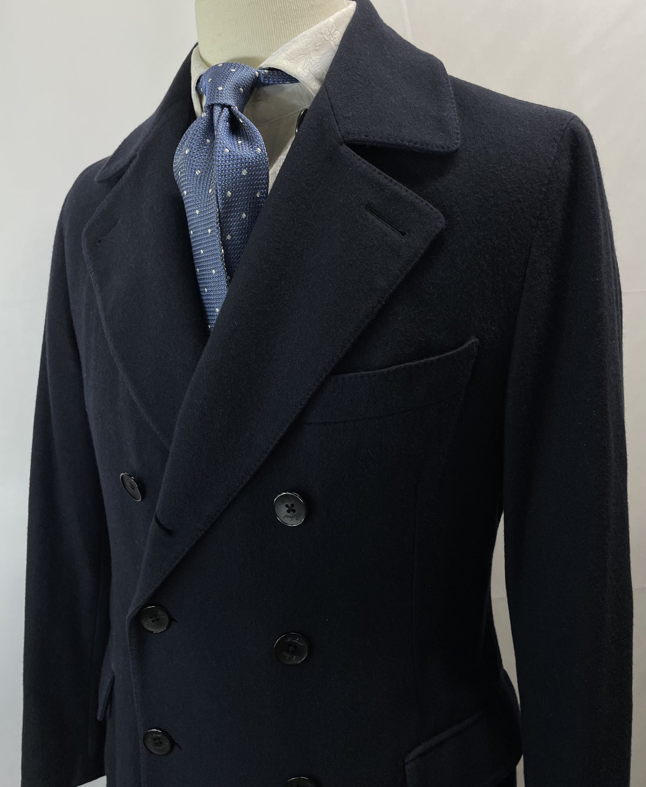 フィッシュマウス型ラペル、フロント3つ×2列ボタン+首元隠しボタン、袖口4つ重ねボタン本開き本切羽、両脇D管留め両玉縁フラップポケット、左胸に美麗なバルカ型ポケット、内側に両玉縁ポケット、贅沢な大見返し仕立て、背抜き裏地、センターベント。