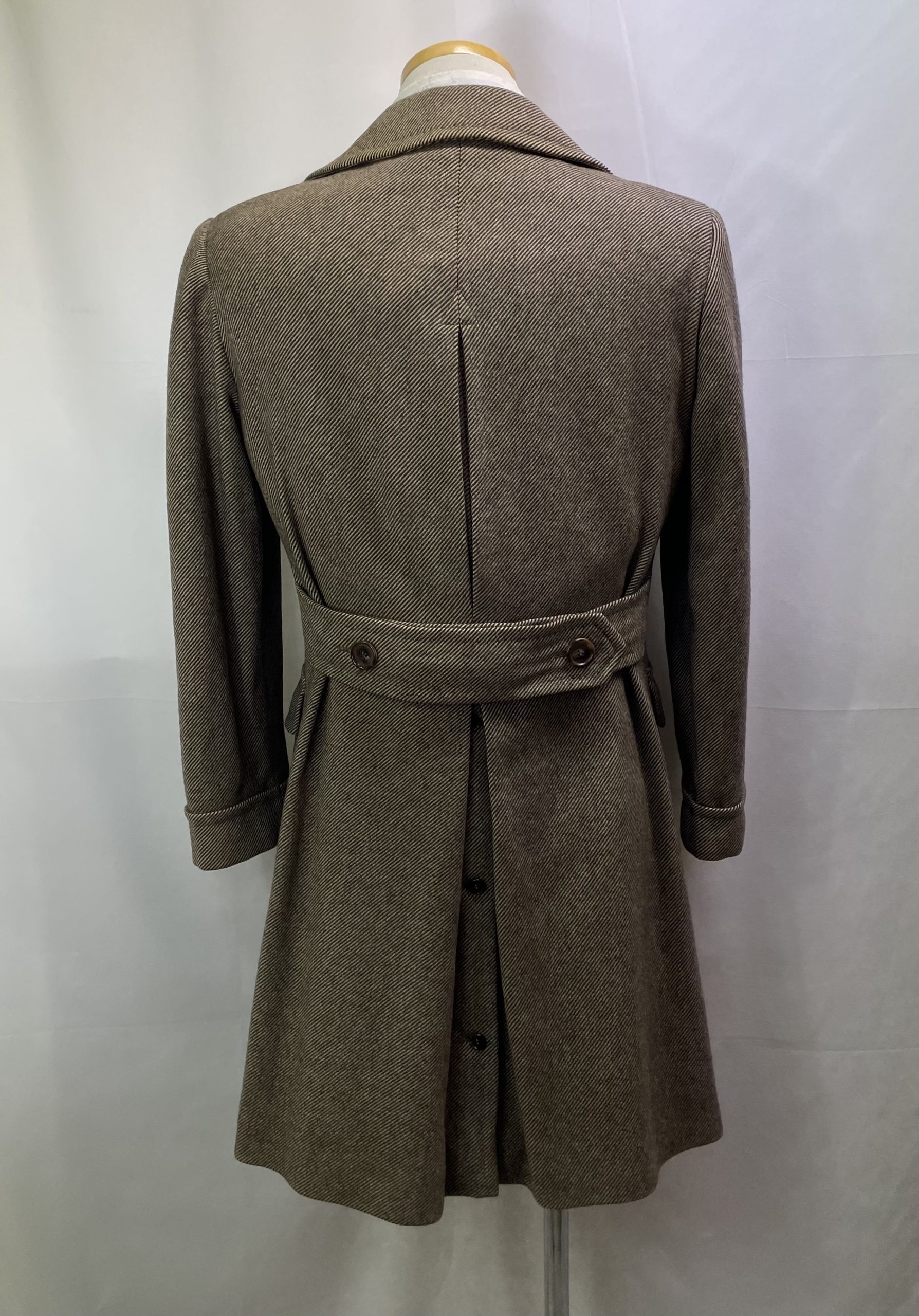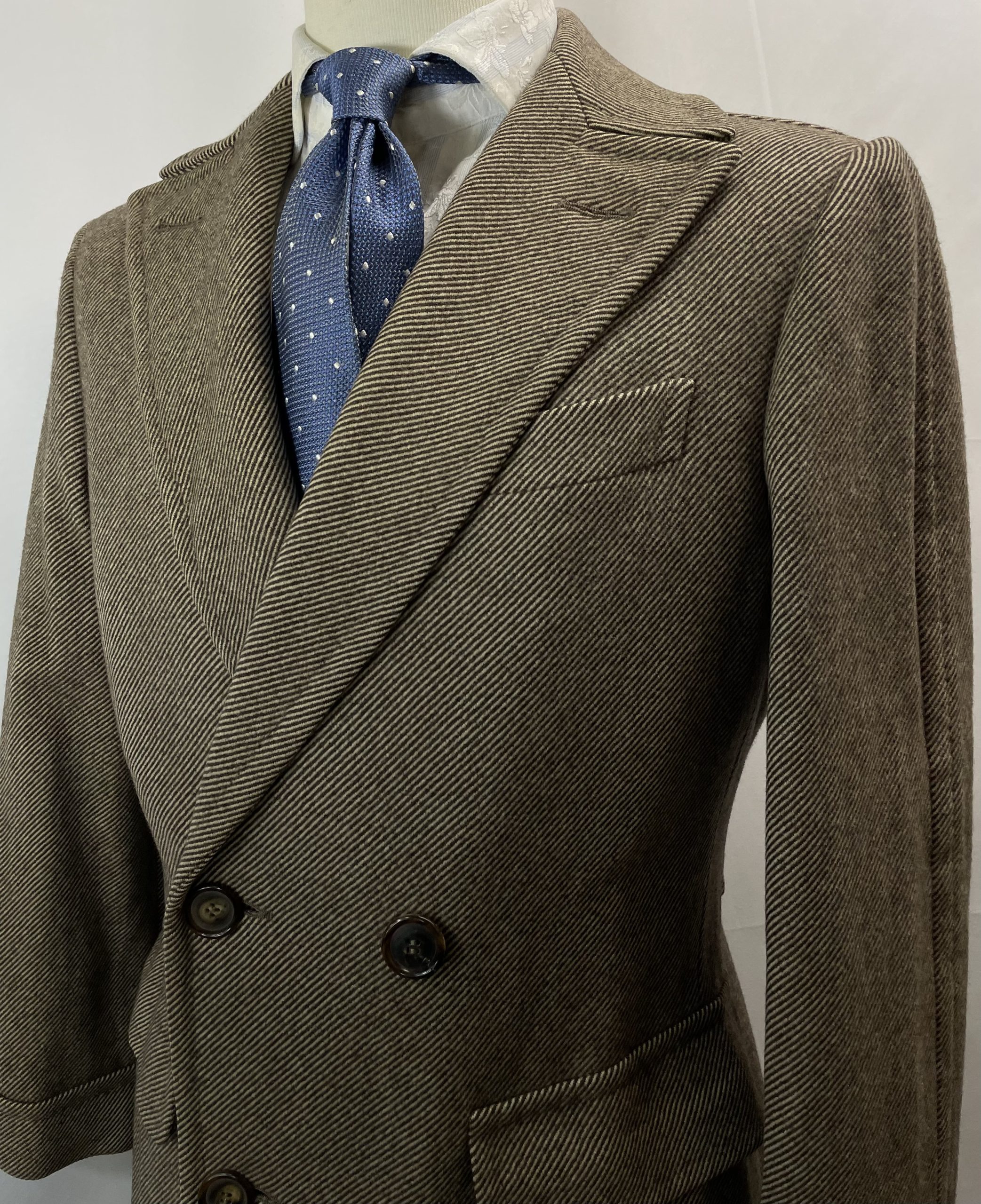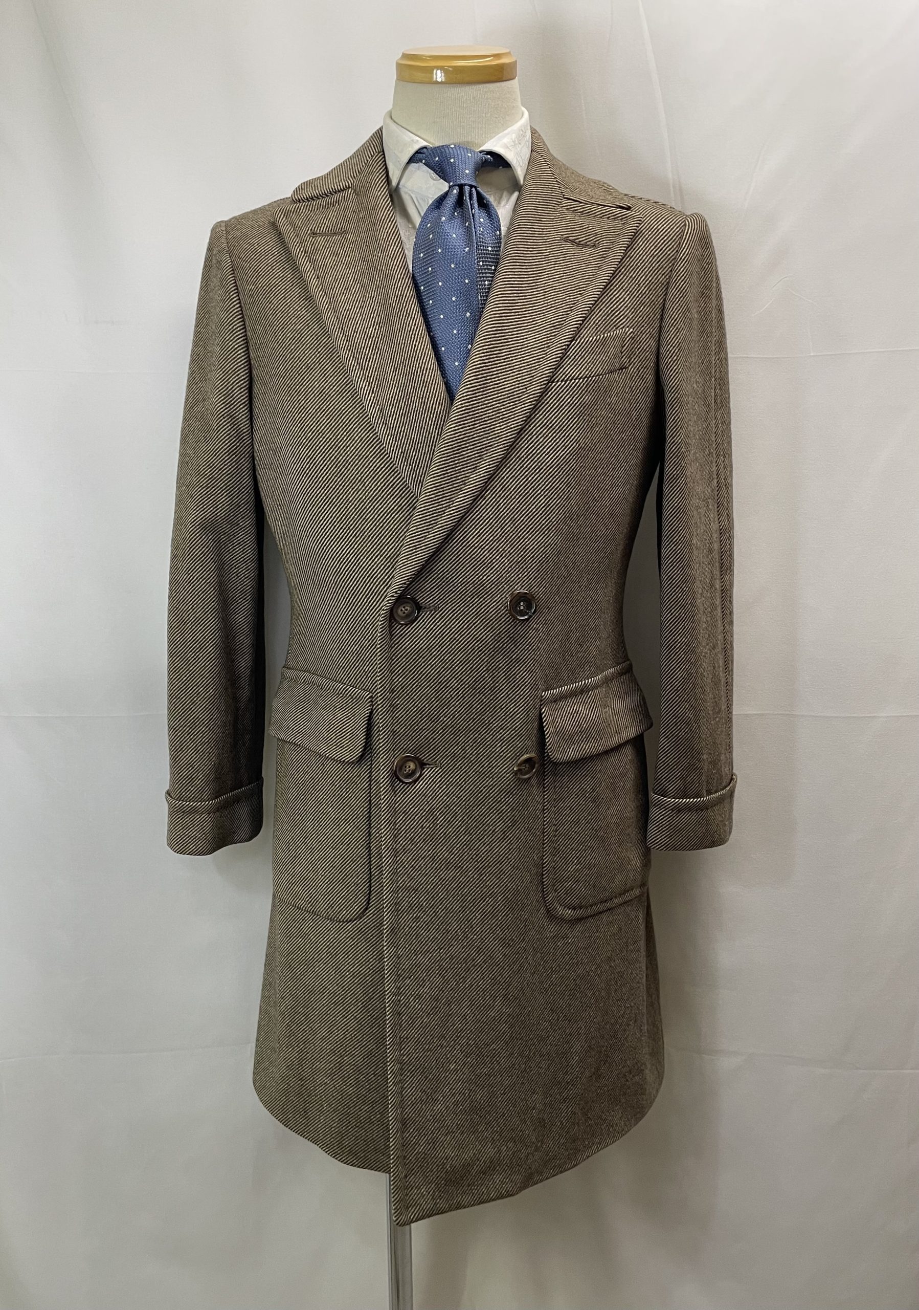 セミピークドラペル、フロント2つ×2列ボタン、袖口ダブルカフ仕様、左胸に美麗なバルカ型ポケット、両脇にフラップ付きパッチポケット、背側2ボタン留めウエストベルト付き、内側に両玉縁ポケット、総裏地、ボタン留めセンタープリーツベント。