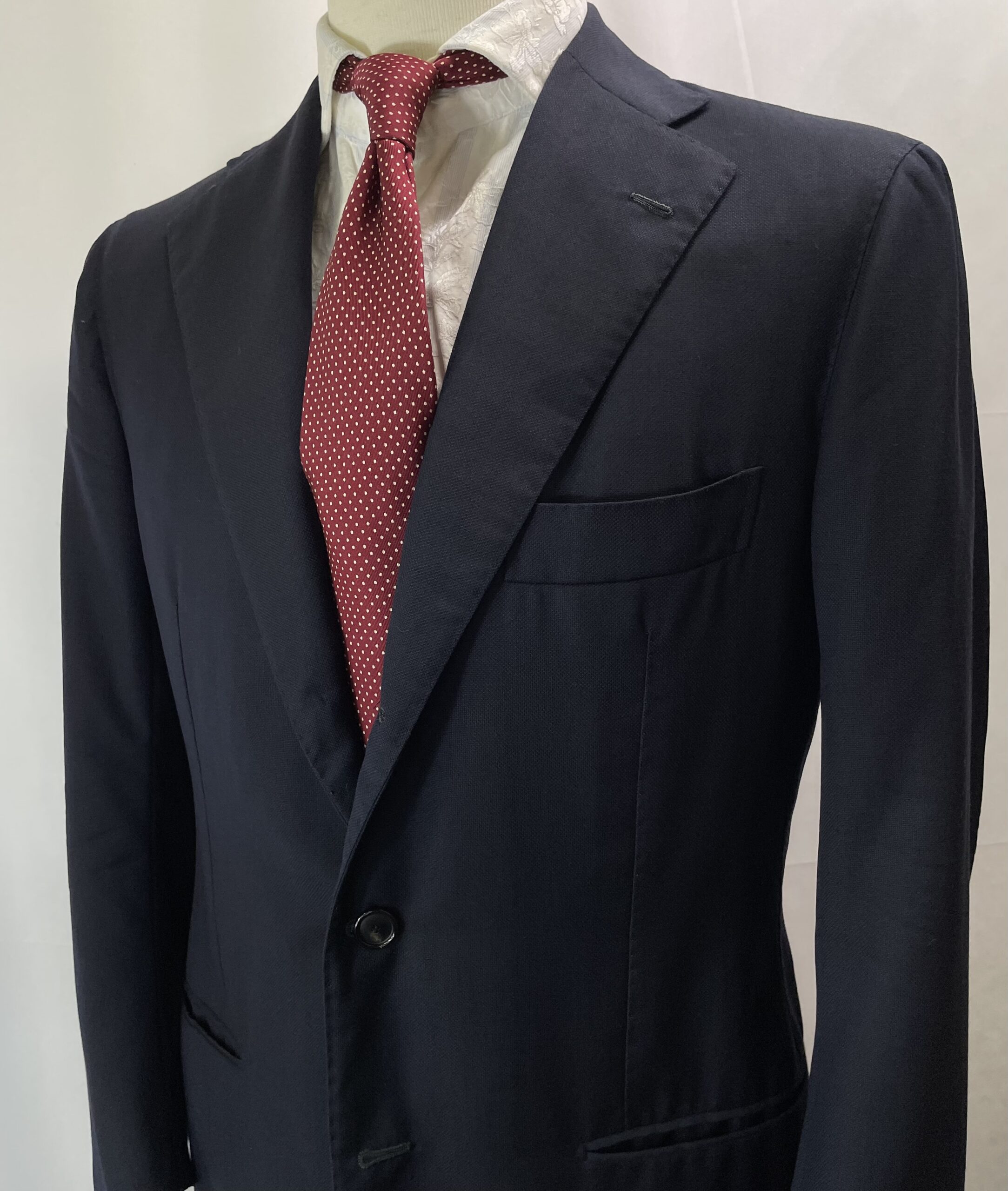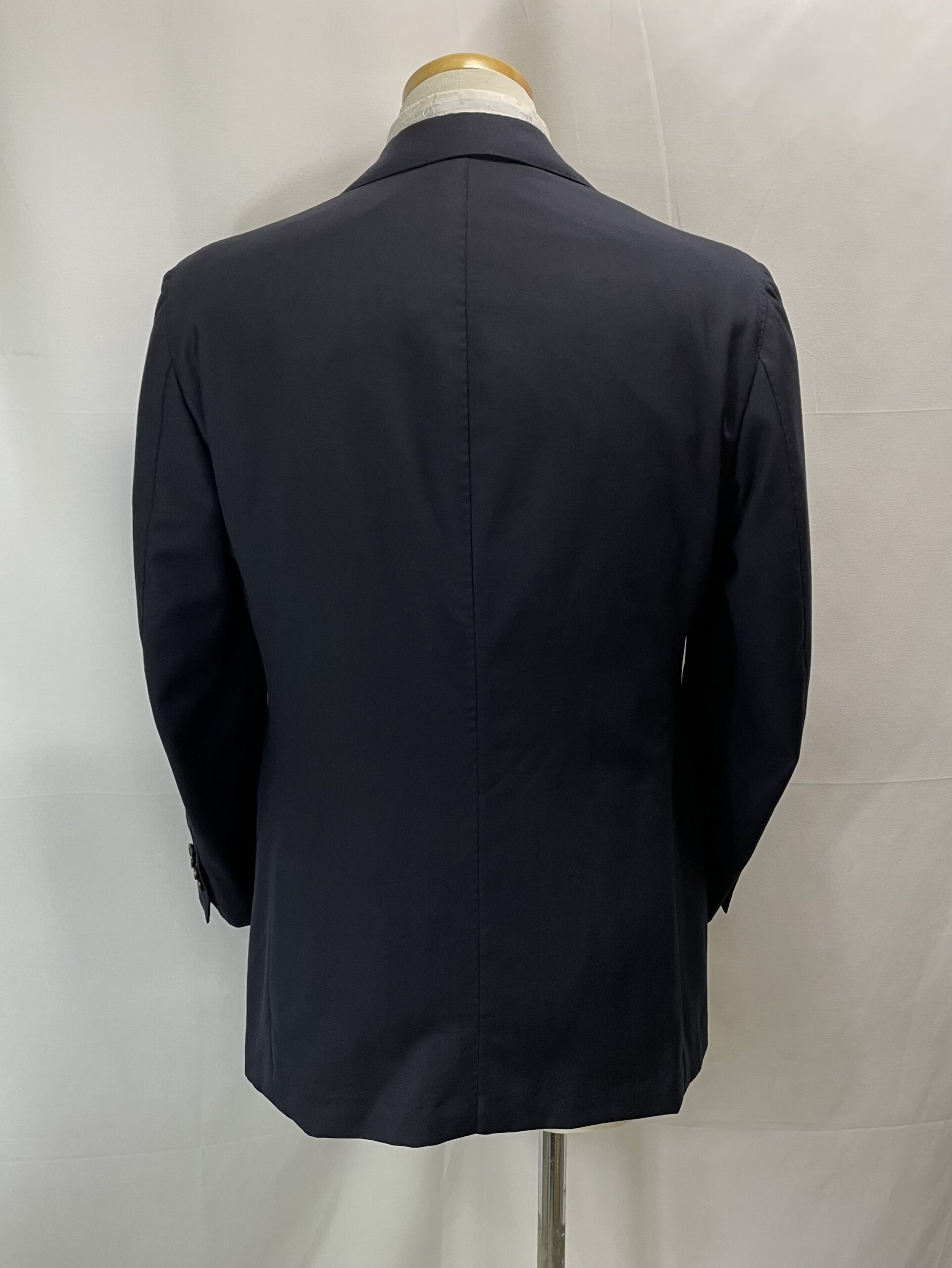 ハイゴージノッチドラペル、フロント3つボタン、袖口は4つ重ねボタン本開き本切羽(第4ボタン眠り)、両脇D管留め&両玉縁ポケット、左胸に美麗なカーブのバルカポケット、内側に両玉縁ポケット3つ、お台場仕立て、背抜き裏地、ノーベント。