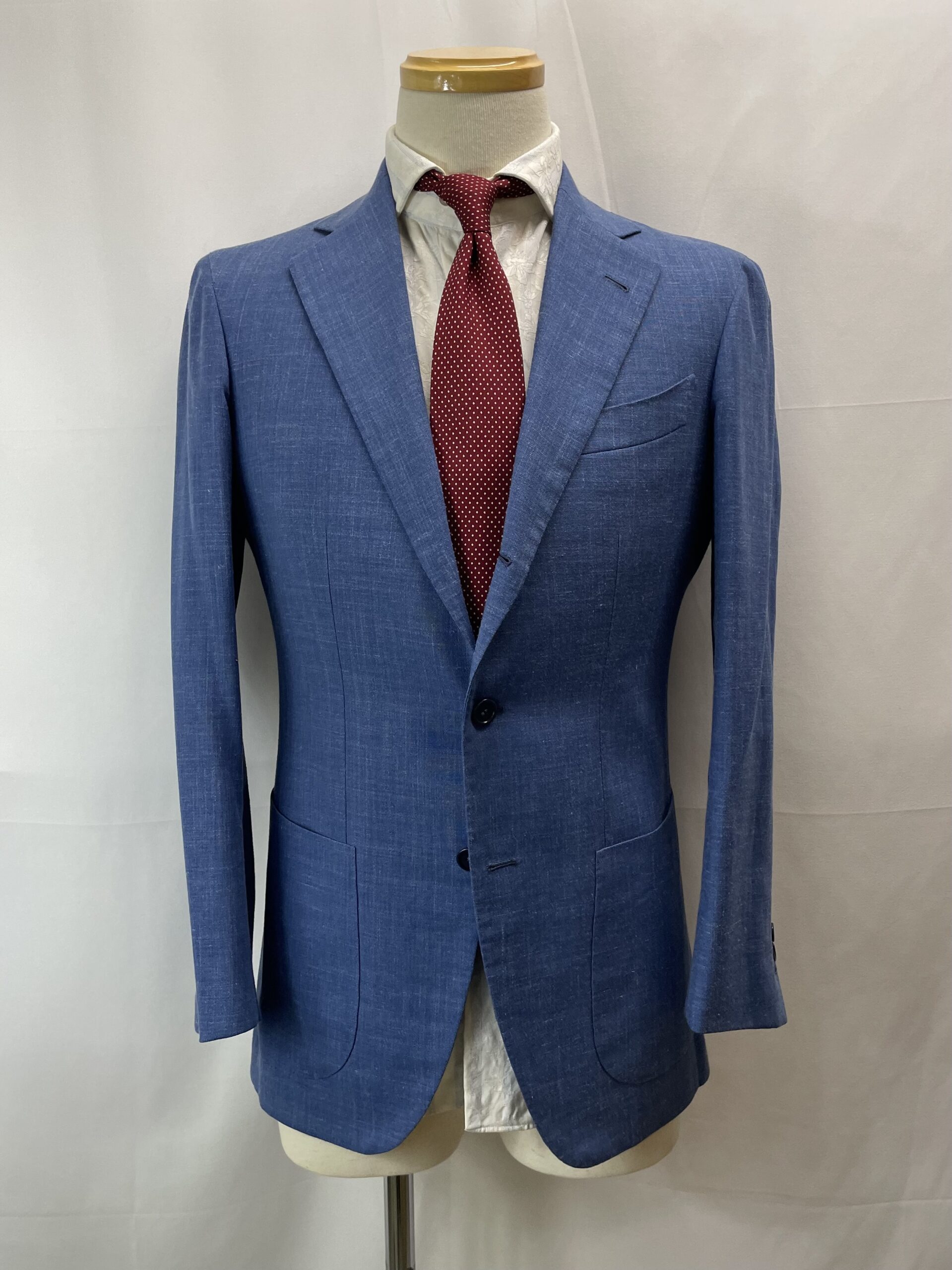 ハイゴージノッチドラペル、フロント3つボタン、袖口は3つキッスボタン本開き本切羽、両脇ラウンドパッチポケット、左胸に美しいカーブのバルカポケット、内側に両玉縁ポケット2つ、お台場仕立て、背抜き裏地、サイドベンツ。