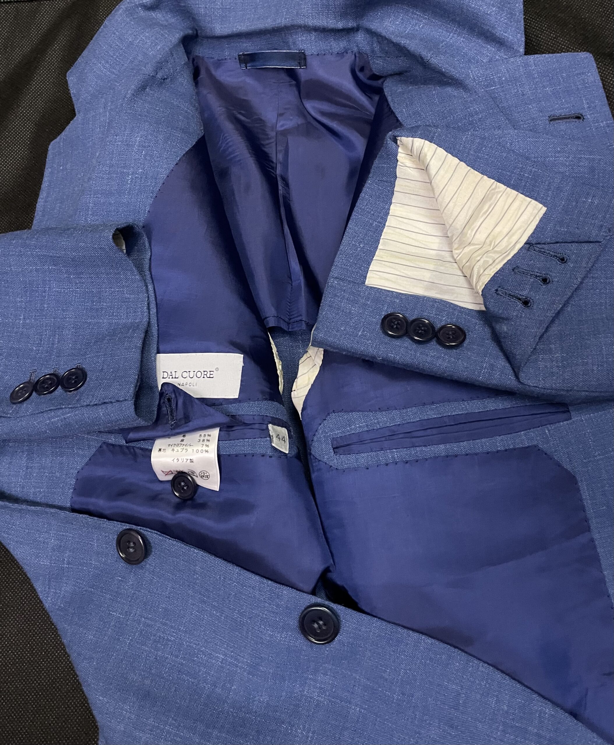 生産数が少なく稀少なサルトリアナポレターナの最高峰【DAL CUORE(ダルクオーレ)】モダンで正統なクラシコイタリア~ナポリ仕立ての美しい極上テーラードジャケットを1点のみ、お探しの方にお安くお譲りします。