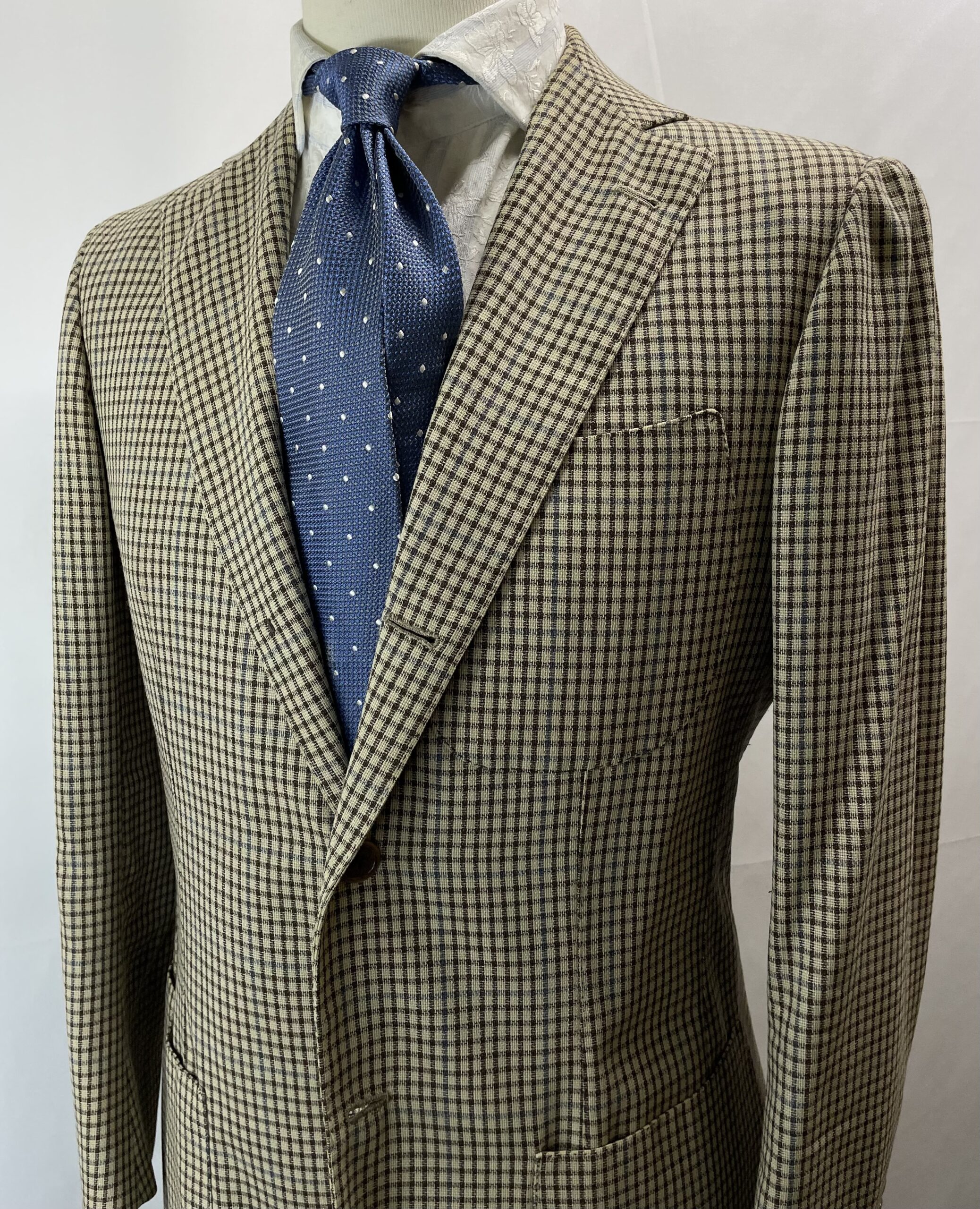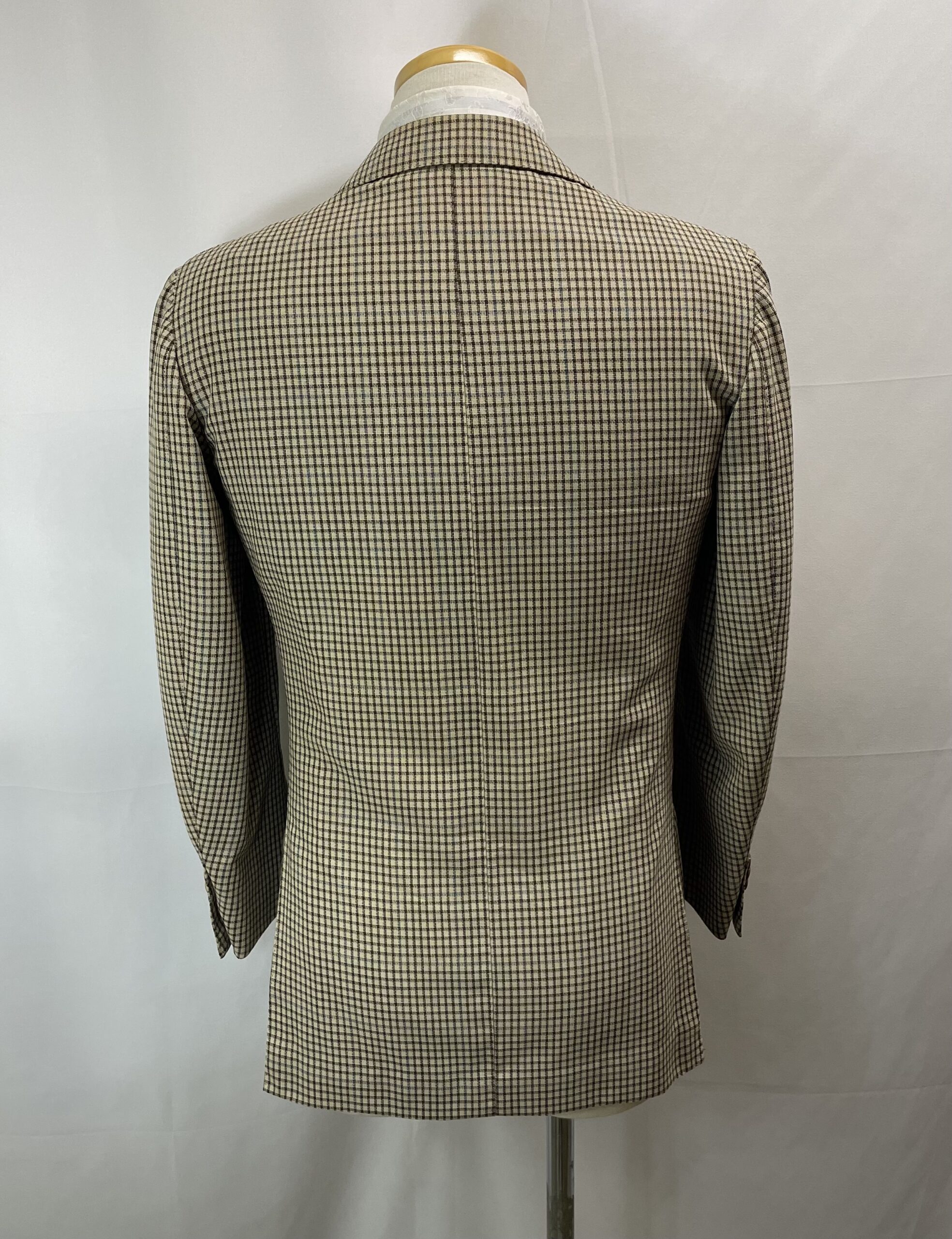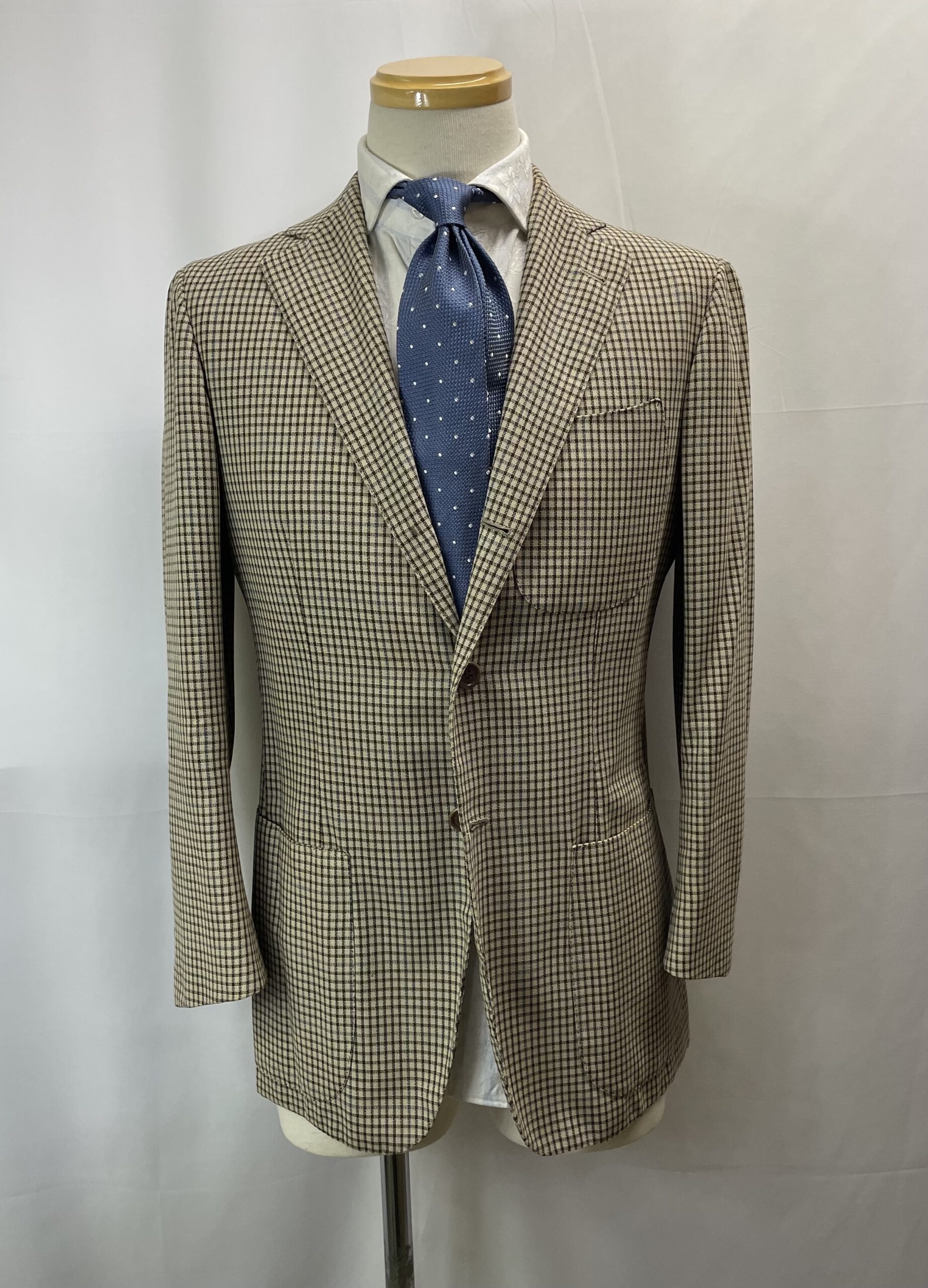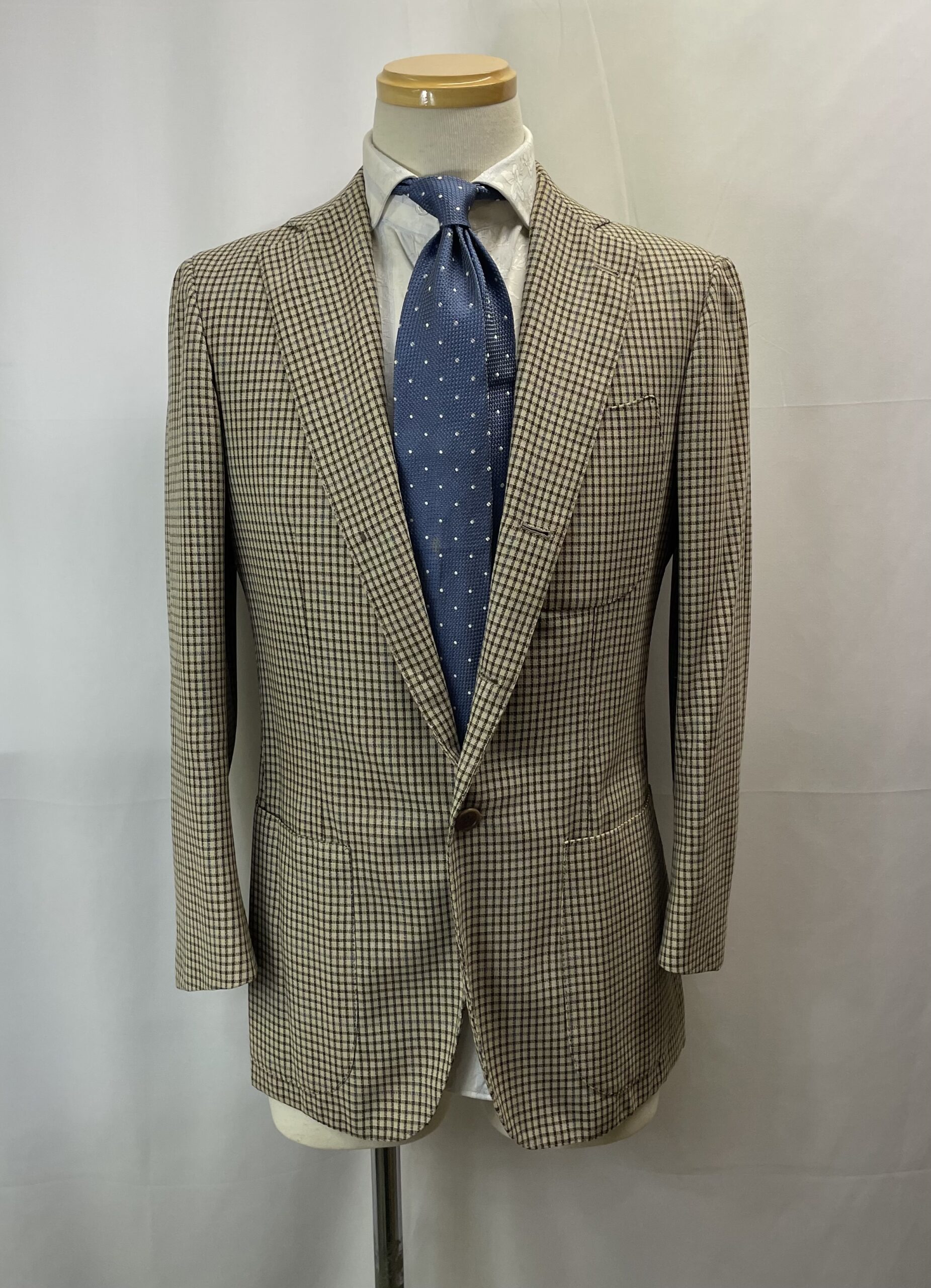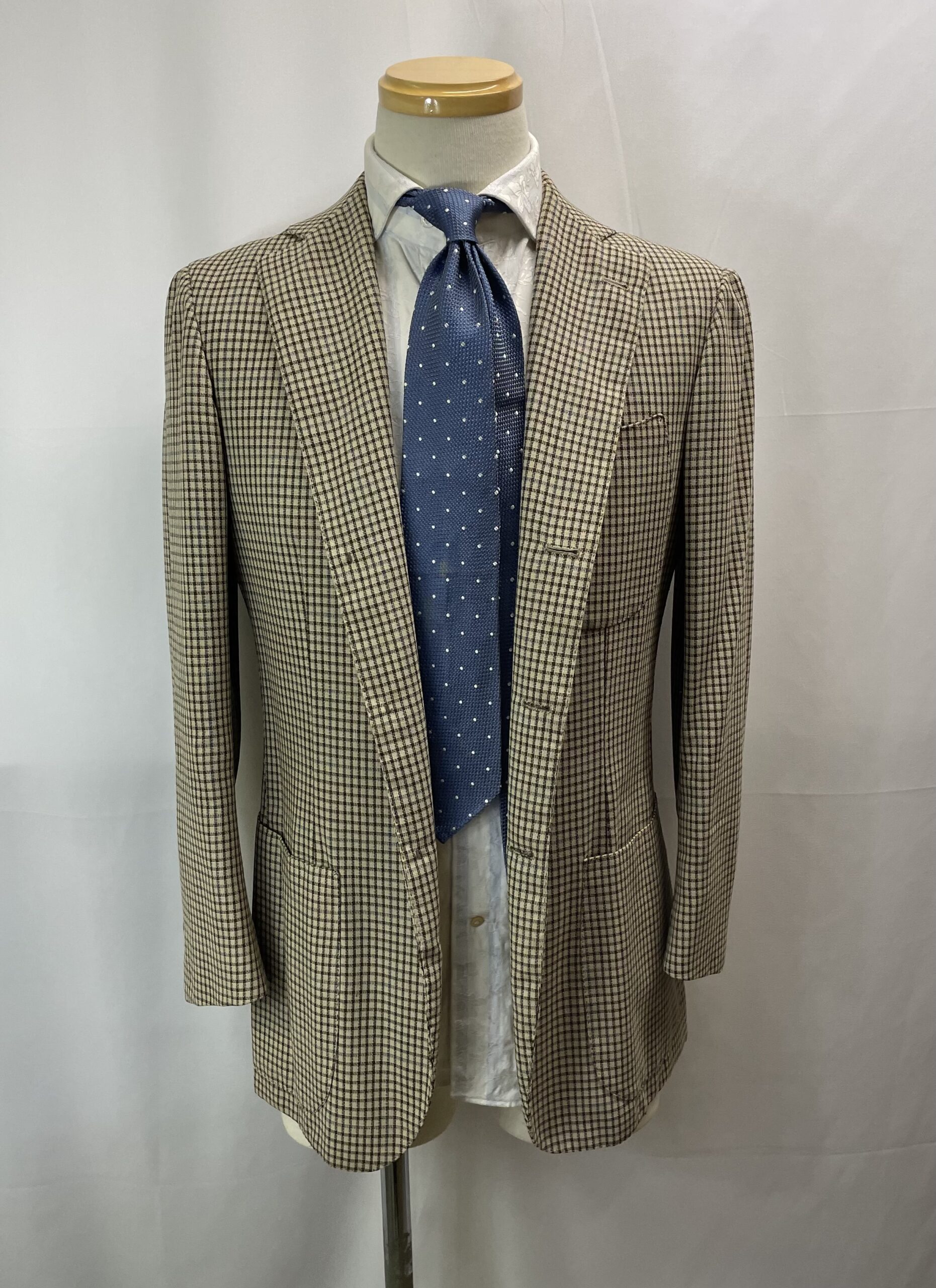 ハイゴージノッチドラペル、フロント3つボタン、袖口は4つボタン本切羽、左胸パッチポケット、両脇ラウンドパッチポケット、内側に両玉縁ポケット2つ、大見返し仕立て、背抜き裏地、サイドベンツ。