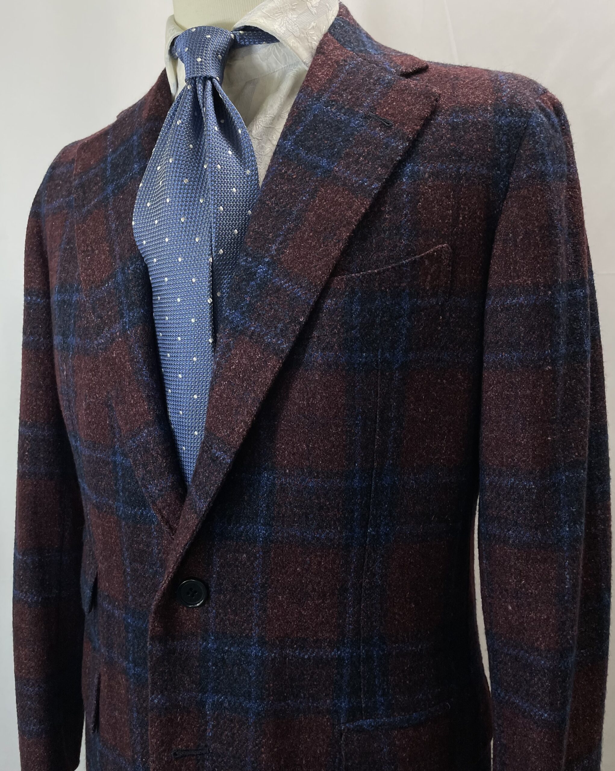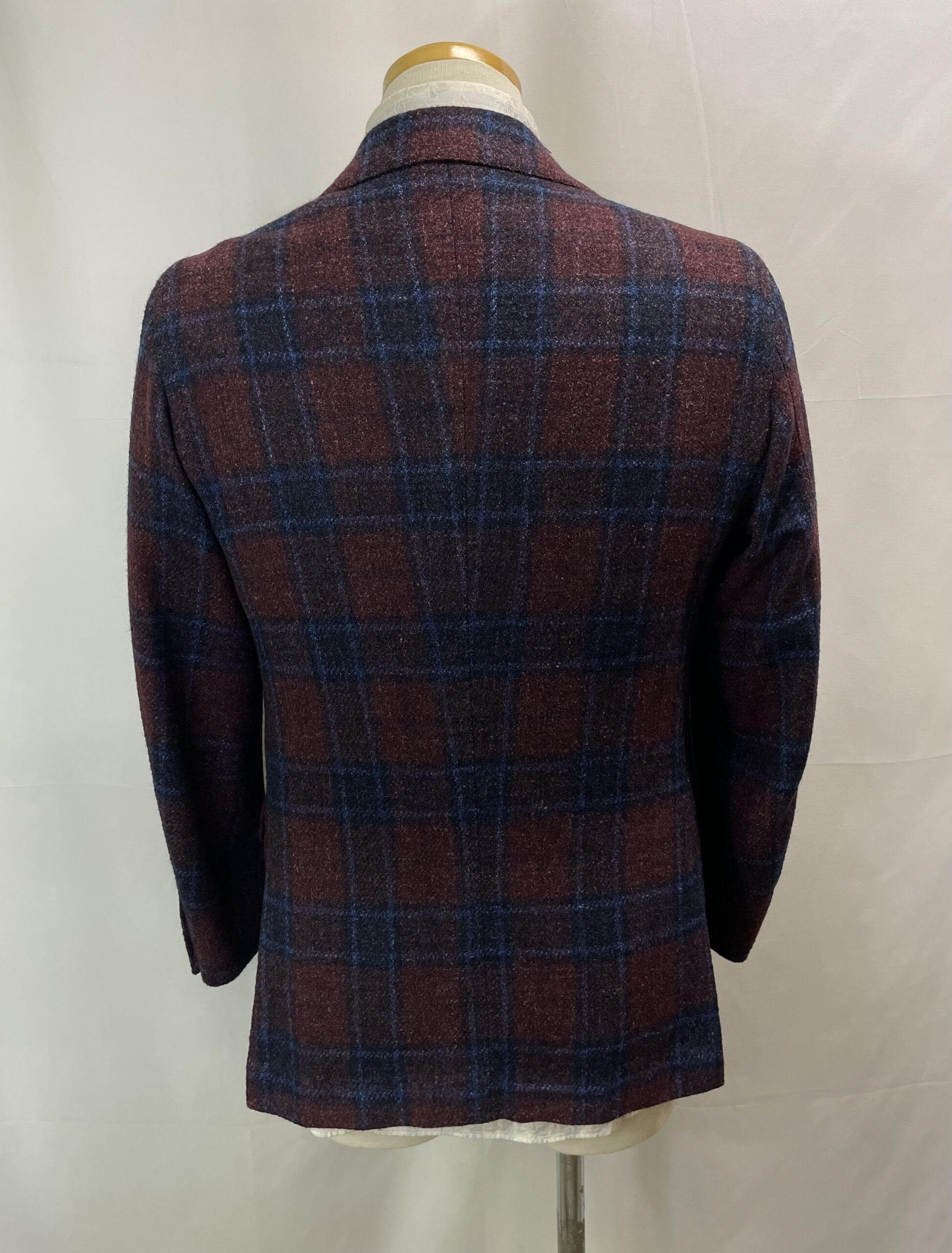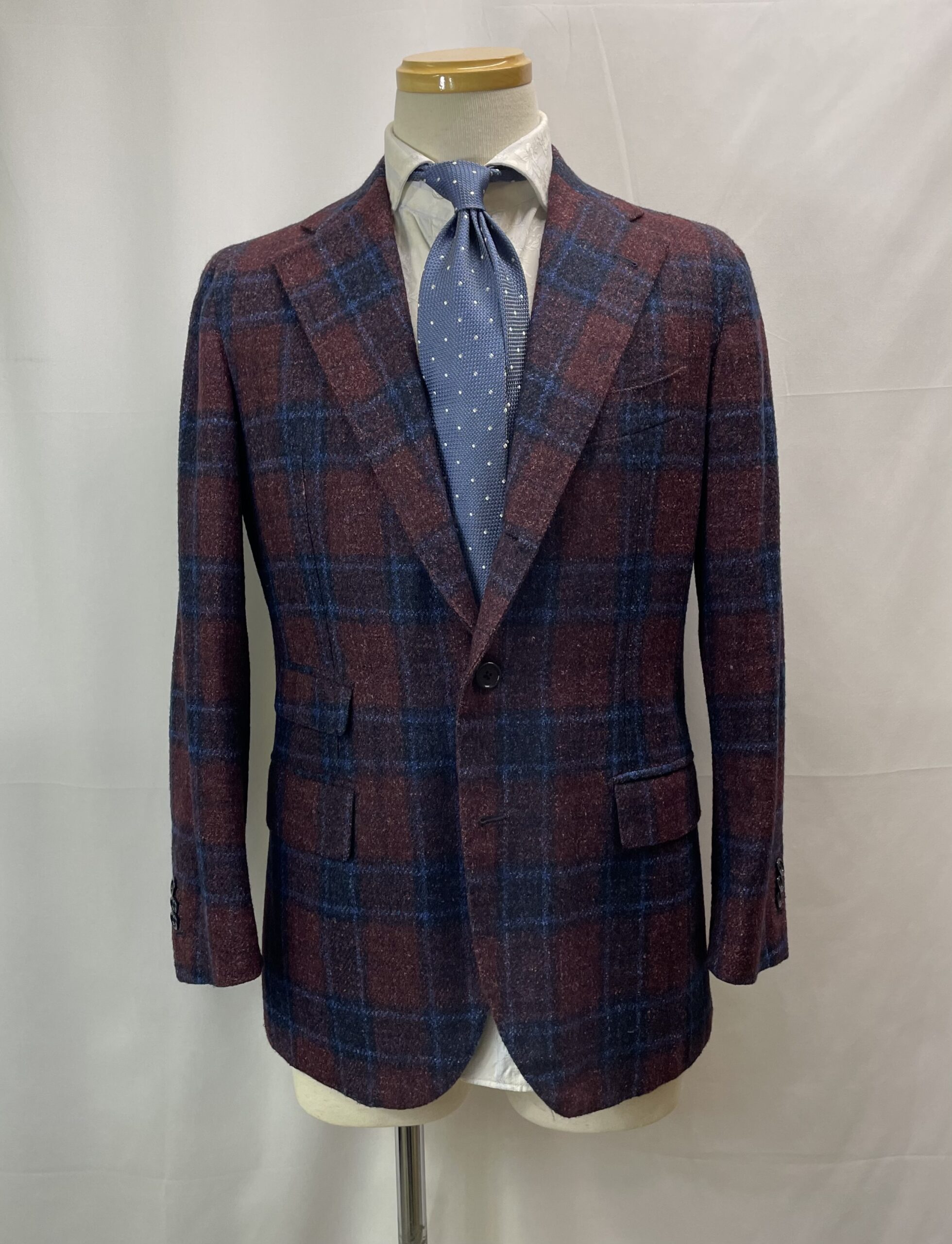 立体的で美麗なナチュラルショルダーにグラマラスなチェスト~ウエスト周り、見るからに洒脱でダンディな茶系色マルチカラーのチェック格子柄生地が、エレガントなフォルムと相まって文化的で洗練された印象を与えます。